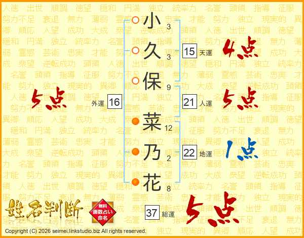 小(3画)久(3画)保(9画) 菜(12画)乃(2画)花(8画)