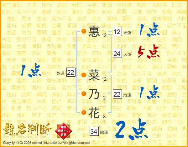 惠菜乃花さんの総運は34画の2点!