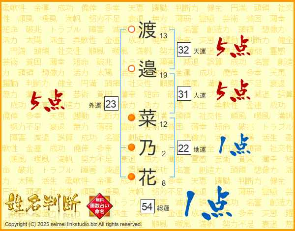 渡(13画)邉(19画) 菜(12画)乃(2画)花(8画)