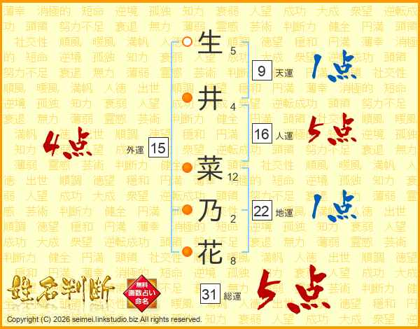 生(5画)井(4画) 菜(12画)乃(2画)花(8画)