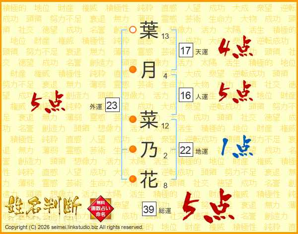 葉(13画)月(4画) 菜(12画)乃(2画)花(8画)