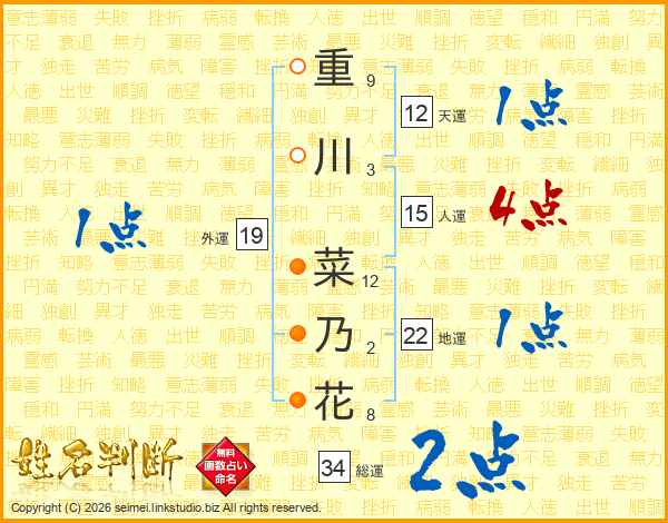 重(9画)川(3画) 菜(12画)乃(2画)花(8画)