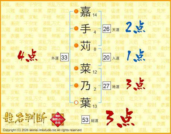 嘉手苅菜乃葉さんの外運は33画の4点!