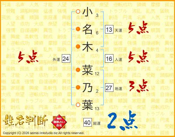 小名木菜乃葉さんの天運は13画の5点!