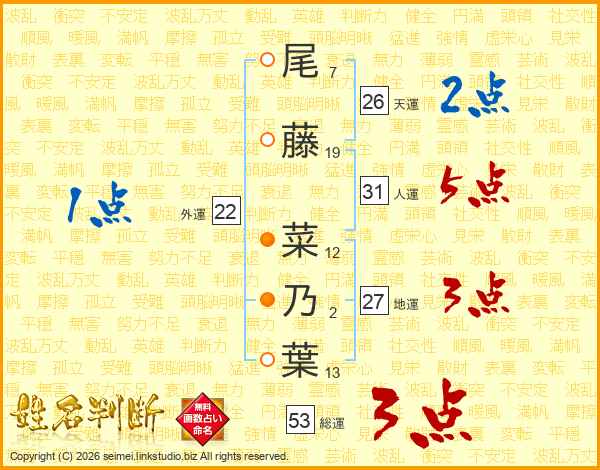 尾(7画)藤(19画) 菜(12画)乃(2画)葉(13画)