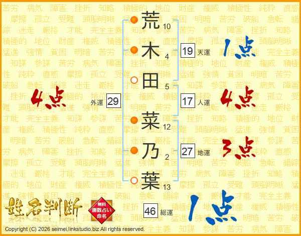 荒(10画)木(4画)田(5画) 菜(12画)乃(2画)葉(13画)