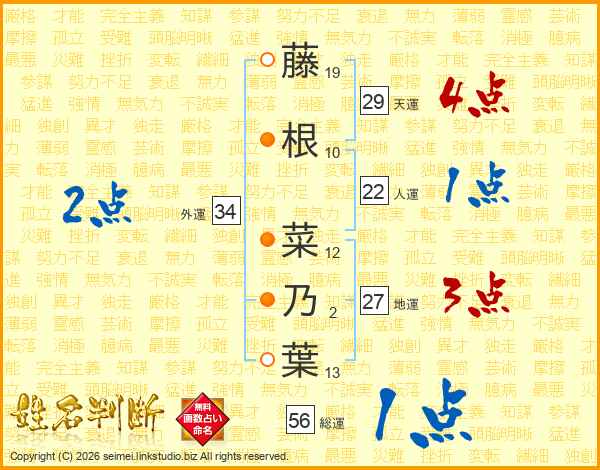 藤(19画)根(10画) 菜(12画)乃(2画)葉(13画)