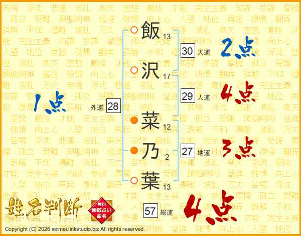 飯(13画)沢(17画) 菜(12画)乃(2画)葉(13画)