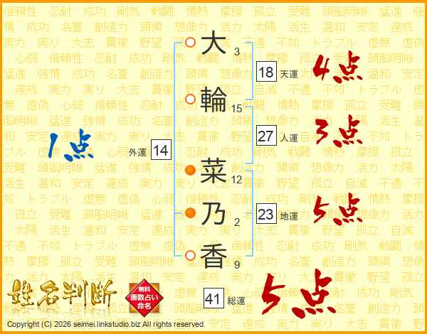 大(3画)輪(15画) 菜(12画)乃(2画)香(9画)