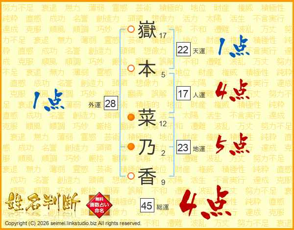 嶽(17画)本(5画) 菜(12画)乃(2画)香(9画)