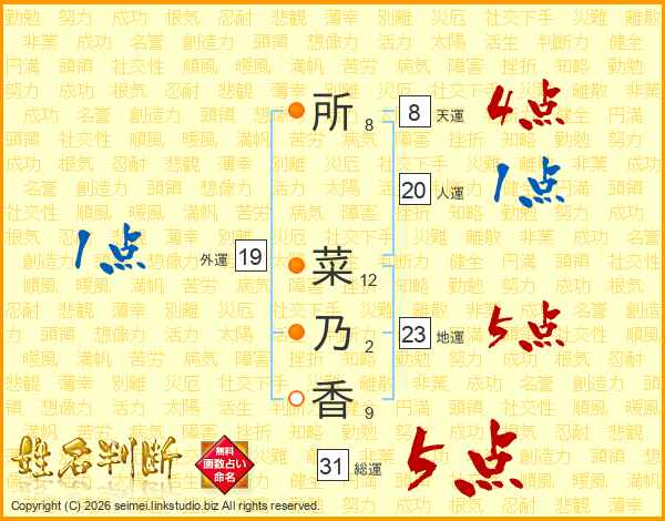 所(8画) 菜(12画)乃(2画)香(9画)