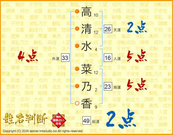 高(10画)清(12画)水(4画) 菜(12画)乃(2画)香(9画)