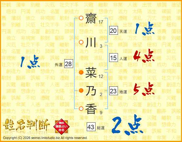 齋川菜乃香さんの総運は43画の2点!