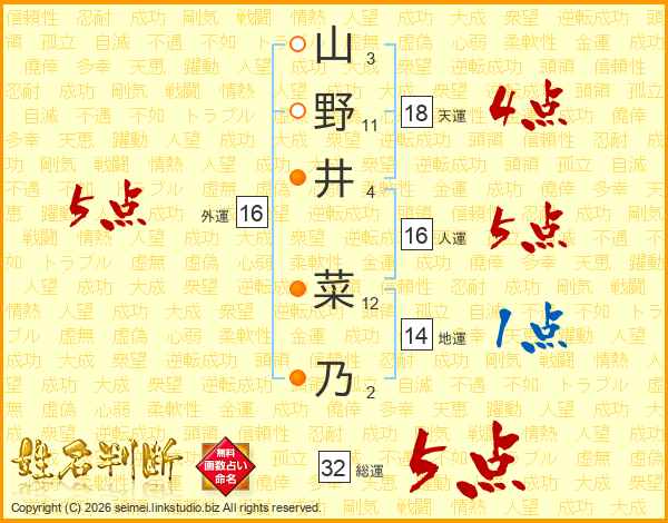 山野井菜乃さんの総運は32画の5点!