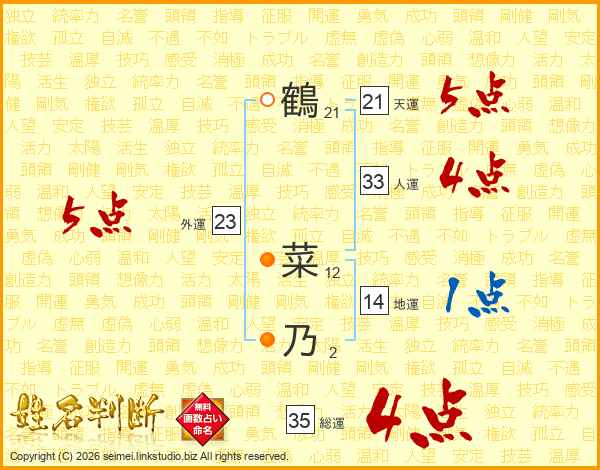 生活面を象徴する運勢です。外部から受ける影響力を表し、結婚運、家庭運や職場、環境への順応性を表します。総運から人運を引いた画数。姓や名が1文字の場合を除く。