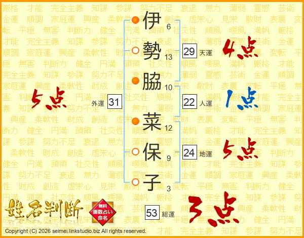 伊(6画)勢(13画)脇(10画) 菜(12画)保(9画)子(3画)