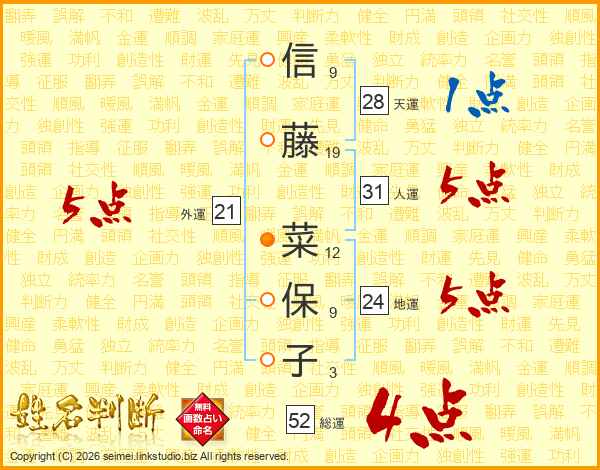 信(9画)藤(19画) 菜(12画)保(9画)子(3画)