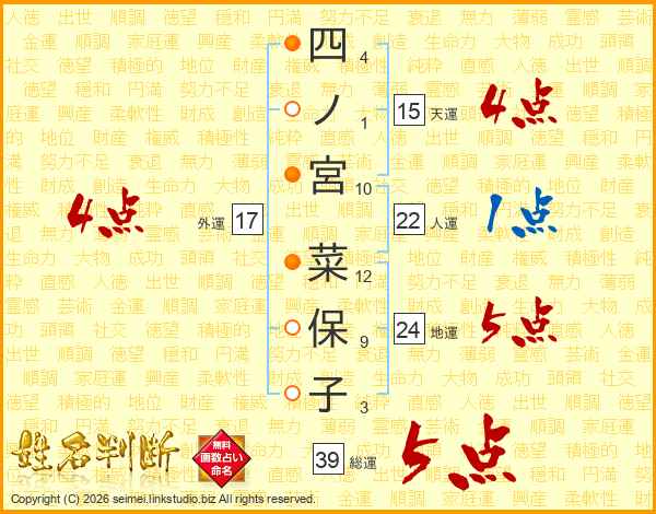四(4画)ノ(1画)宮(10画) 菜(12画)保(9画)子(3画)