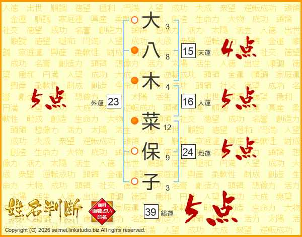 大(3画)八(8画)木(4画) 菜(12画)保(9画)子(3画)