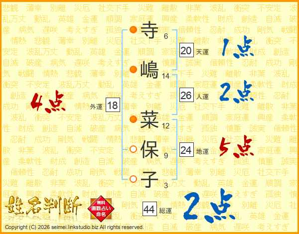 寺(6画)嶋(14画) 菜(12画)保(9画)子(3画)