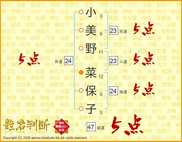 小(3画)美(9画)野(11画) 菜(12画)保(9画)子(3画)