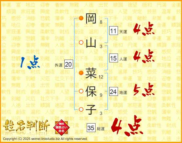 岡(8画)山(3画) 菜(12画)保(9画)子(3画)