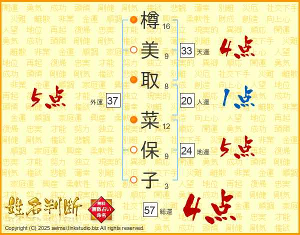 樽(16画)美(9画)取(8画) 菜(12画)保(9画)子(3画)