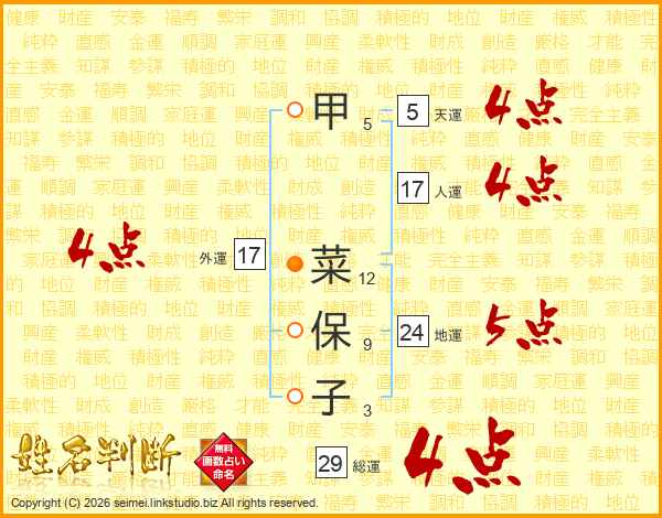 生活面を象徴する運勢です。外部から受ける影響力を表し、結婚運、家庭運や職場、環境への順応性を表します。総運から人運を引いた画数。姓や名が1文字の場合を除く。