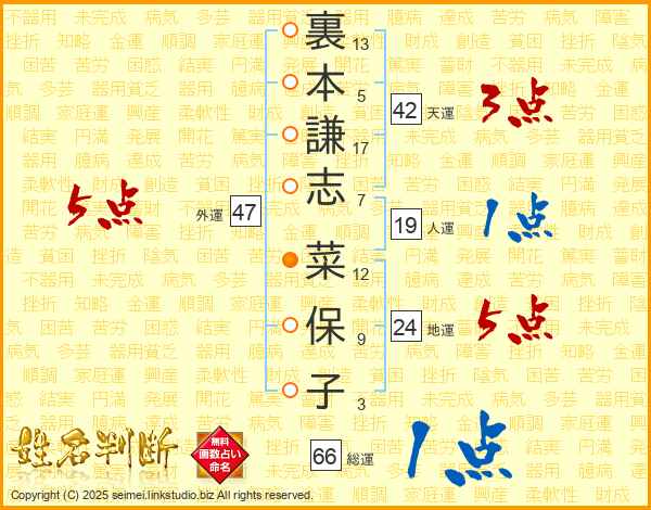 裏(13画)本(5画)謙(17画)志(7画) 菜(12画)保(9画)子(3画)