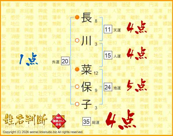 長(8画)川(3画) 菜(12画)保(9画)子(3画)