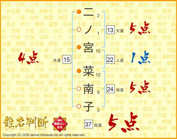 二(2画)ノ(1画)宮(10画) 菜(12画)南(9画)子(3画)
