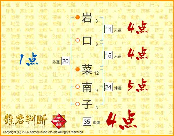 岩(8画)口(3画) 菜(12画)南(9画)子(3画)