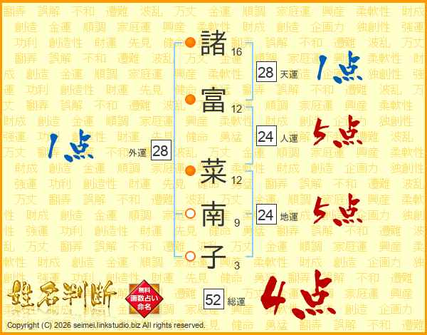 諸(16画)富(12画) 菜(12画)南(9画)子(3画)