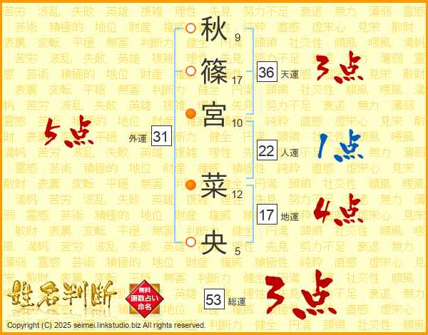 秋篠宮菜央さんの外運は31画の5点!
