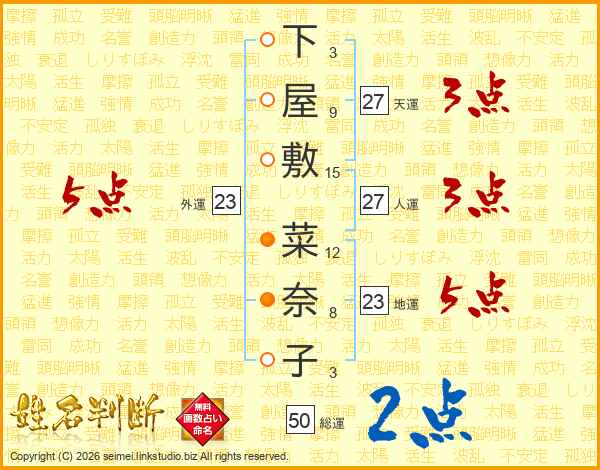 下(3画)屋(9画)敷(15画) 菜(12画)奈(8画)子(3画)