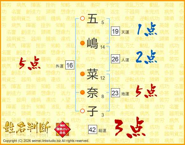 五嶋菜奈子さんの総運は42画の3点!