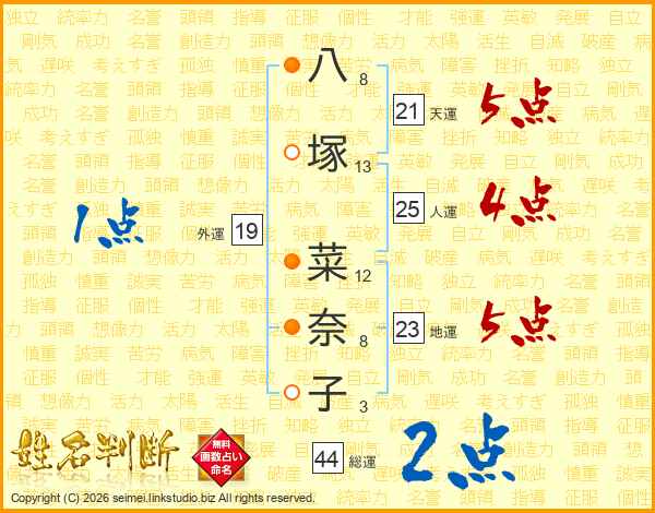 八(8画)塚(13画) 菜(12画)奈(8画)子(3画)