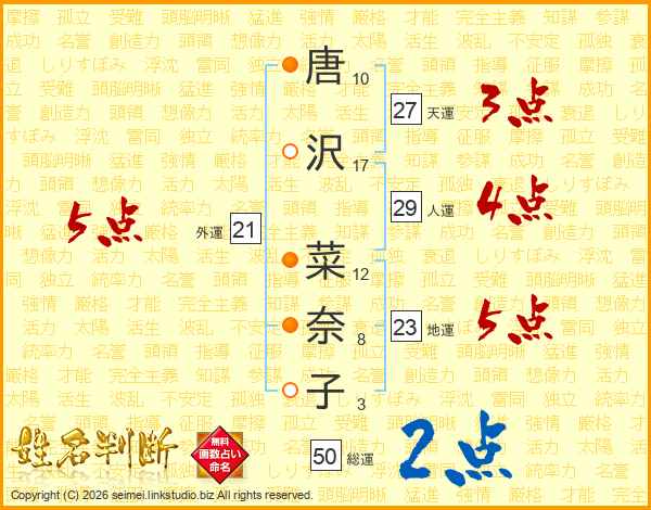 唐(10画)沢(17画) 菜(12画)奈(8画)子(3画)