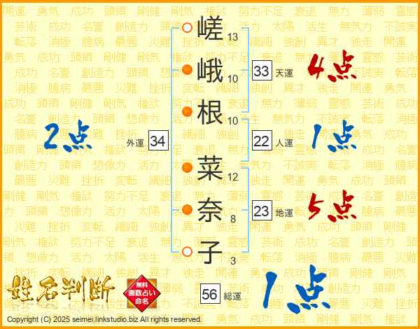 嵯(13画)峨(10画)根(10画) 菜(12画)奈(8画)子(3画)