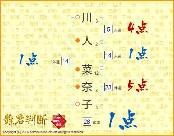川(3画)人(2画) 菜(12画)奈(8画)子(3画)