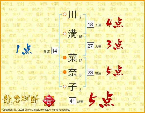 川(3画)満(15画) 菜(12画)奈(8画)子(3画)