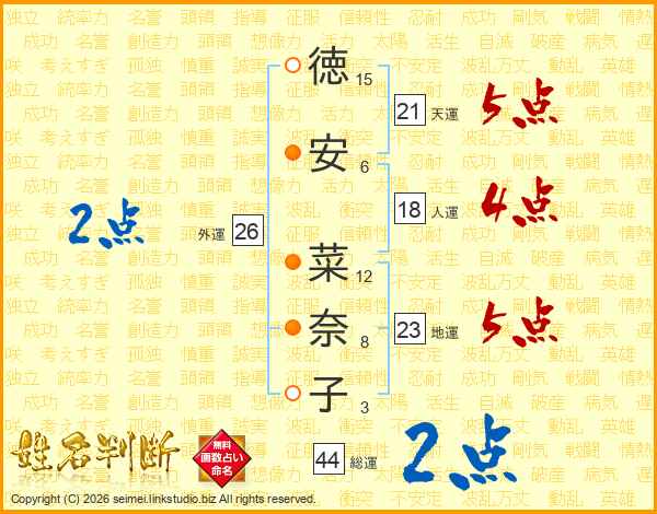 徳(15画)安(6画) 菜(12画)奈(8画)子(3画)