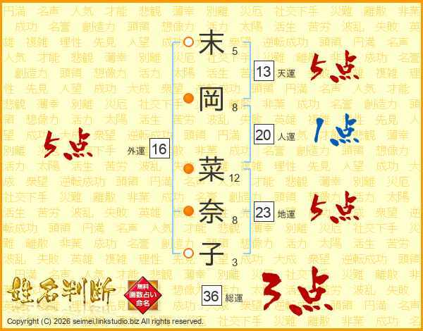 末(5画)岡(8画) 菜(12画)奈(8画)子(3画)