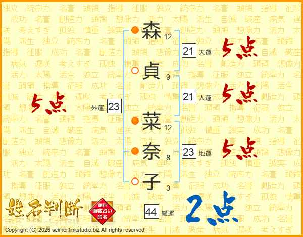 森貞菜奈子さんの総運は44画の2点!