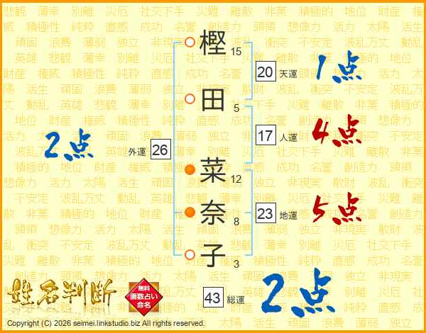 樫(15画)田(5画) 菜(12画)奈(8画)子(3画)