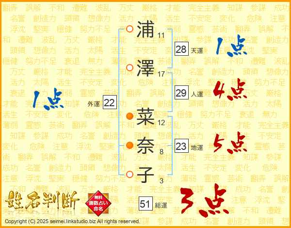 浦(11画)澤(17画) 菜(12画)奈(8画)子(3画)
