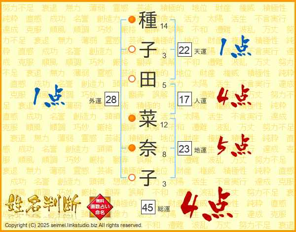 種子田菜奈子さんの総運は45画の4点!