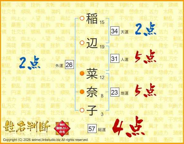 稲(15画)辺(19画) 菜(12画)奈(8画)子(3画)