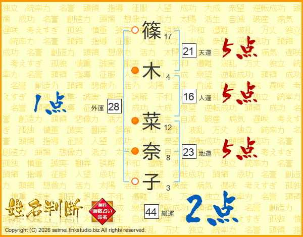 篠(17画)木(4画) 菜(12画)奈(8画)子(3画)