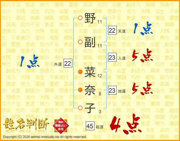 野(11画)副(11画) 菜(12画)奈(8画)子(3画)